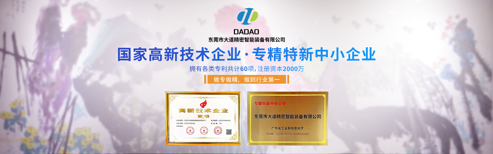 大道精密成立于2019年,公司注冊(cè)資本1000萬元,擁有辦公室、廠房等18,000多平方米。已通過ISO9001:2015國(guó)際質(zhì)量管理體系認(rèn)證,擁有國(guó)家各類專利共計(jì)58項(xiàng),獲得“中國(guó)大道.商標(biāo)”和“一帶一路十周年 .國(guó)禮品牌”等榮譽(yù)稱號(hào),屬于國(guó)家高新技術(shù)企業(yè)。2023年4月成立了“東莞市大道精密智能裝備有限公司關(guān)心下一代工作委員會(huì)”,是東莞市企石鎮(zhèn)工商聯(lián)副會(huì)長(zhǎng)單位、東莞市企石鎮(zhèn)文學(xué)藝術(shù)界聯(lián)合會(huì)副主席單位、東莞市環(huán)保包裝行業(yè)協(xié)會(huì)副會(huì)長(zhǎng)單位、東莞市數(shù)控裝備行業(yè)協(xié)會(huì)第二屆會(huì)長(zhǎng)單位、廣東省包裝技術(shù)協(xié)會(huì)常務(wù)理事單位、廣東省膠粘劑行業(yè)協(xié)會(huì)理事單位。